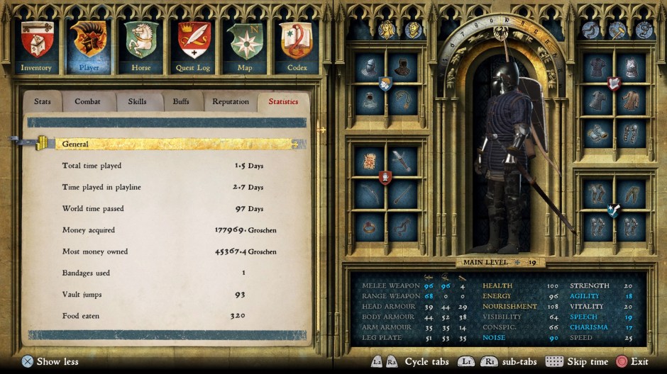 In fact, I made a lot of mistakes playing this game early on and it culminated with me killing the entire guard of Sasau. I didn’t realize that the second half of the main story took place in Sasau and it’s monastery, complete with an infuriating week spent pretending to be an inductee into the priesthood, so by the time this part of the story rolled around my reputation was less than 20/100 for the entire town. This meant having to spend around $4000 (well, Groschen not dollars) bribing everyone in town so that I could speak to them and sell goods. I ended up spending a total of 9 days in jail for killing the entire guard as well. To pass 9 days of time each day takes roughly one minute and this meant watching the games passage of time wheel spin for 10 minutes straight. In fact this is the biggest problem with playing Kingdom Come: Deliverance in general, waiting in game and loading screens. To be fair I was playing on Playstation 4 Pro and it wouldn’t be as fast or sharp as playing on PC but the loading times for this game were on par with those of the original The Witcher. This was compounded by every quest in the game being relatively specific in it’s time of day because every character in the game is tied to a day/night cycle and their sleep habits. Here is a YouTube video from a live stream where I was progressing the main story:
