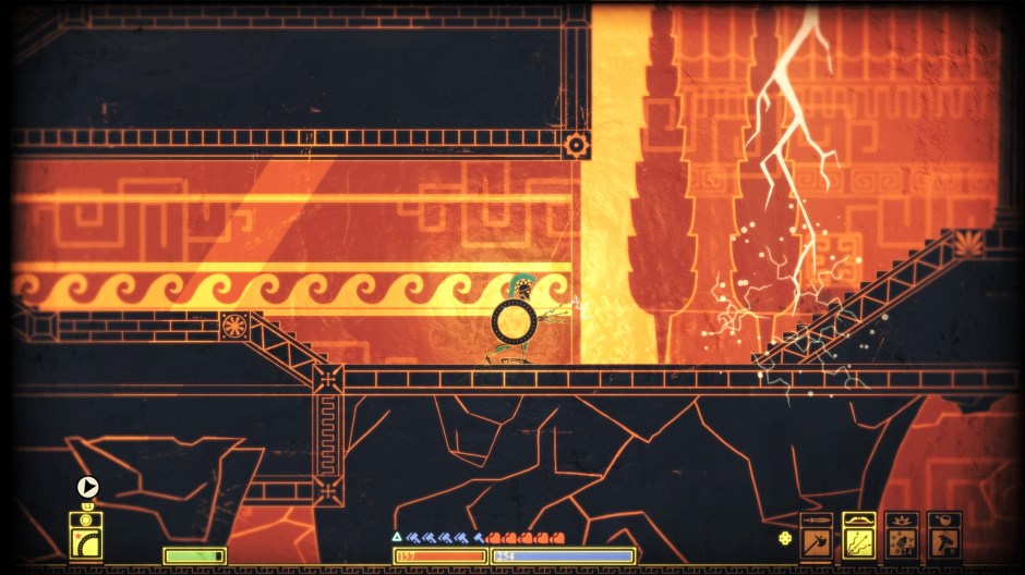 This isn’t simply a platformer with some stabbing involved, though. Character progression involves collecting/buying armor upgrades (which also allow for appearance customization) and buying weapon proficiency upgrades, based on weapon type, from the aforementioned weapons trainer. You’re also able to buy crafting recipes so you can use collected resources to craft weapons, tools and potions. You can craft poultices that raise an undead warrior to fight alongside you, or you can make automatons that shoot arrows at nearby enemies, as well as traps, bombs, and even potions that help you see in the dark without a torch (or light-bearing shield). Since about half of the dungeons in the game are dark or dimly lit I found the Sun Disc’s ability to light up a room incredibly valuable and I sometimes didn’t block during combat so that it wouldn’t end up breaking. The game’s progression hinges on either killing or convincing gods that you deserve their powers and with each power comes a vital perk. You get a ‘double jump’, reduced knockback/interrupt, and even a perk that restores your shield’s durability when not in combat.