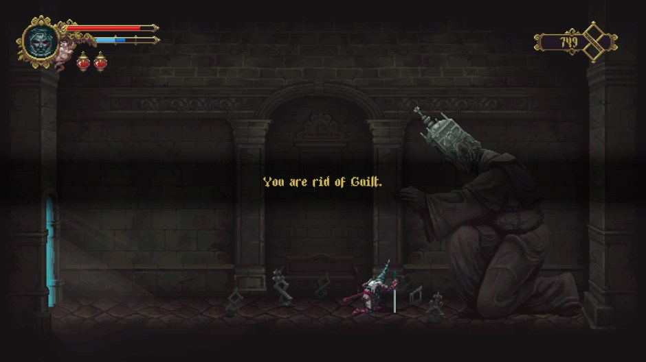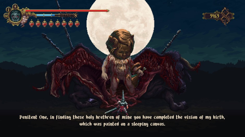 Full motion animated ‘pixel art’ cut-scenes introduce Blasphemous as if it were some alternate reality Sega Saturn game with the parental controls cranked all the way off. A women commits some form of pious, extra bloody suicide to atone for sin and the sword that appears is now yours, implanted in the statue of her corpse. You are ‘the penitent one’ and well, the game is unclear as to who you actually are, why you’ve arisen, and just exactly what side you’re on, if any. The elucidation allowed within a few short but very dense lines of narration make it a bit more clear, this is a world of such religious devotion that corruption and punishment become purpose in a world of true horrors. To further confuse the situation The Miracle is used to refer to strong and cruel religious will ‘from the Gods’ though no specific deity is alluded to until much later. It couldn’t be more obvious that this game is heavily influenced by the Spanish orthodox Christianity as well as the eastern orthodox church in terms of language used, concepts described, and the general theme of punishment as a show of piety. Allusions to the final areas of the game lead the Penitent One to the High Pontiff, essentially the Pope of this world who sits on a mountain of ash accumulated by atrocities against non-believers (or different thinkers). In fact it turns out you are the sole survivor of the massacre of the Brotherhood of the Silent Sorrow tasked with a crusade of revenge against their extinction. Whats that? You played the entire game and didn’t get any of that? Well, maybe I’m an idiot but I did not understand any of this because I did not read the individual lore for each item I’d picked up. The choice to keep the progress of the game fairly brisk and not gate certain events with points of important and clear narration is what I’d consider the only damning failure of this fine game. I dreaded having to appreciate a story that was kept intentionally hidden in the corners of the experience, it is so much less impactful than it could be otherwise.