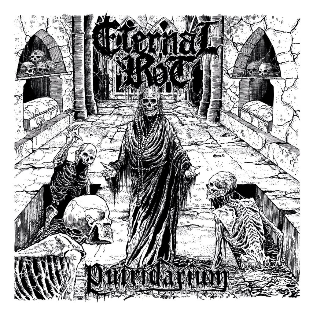 The second album from UK/Poland based death/doom metal duo Eternal Rot doesn’t take a ‘commercial’ or pandering approach, instead ‘Putridarium’ slips out as a still-underground death metal album with thick horror atmosphere and tree-sized clobbering riffs that balance traditional/stoner doom metal riffs with the severity of classic death/doom metal. This is what I love to see from an extreme doom metal band, zero fucks given about trendiness or whatever and executing their vision with more precise and purposeful works over time. To be fair guitarist, vocalist, bassist, and main songwriter P. Mayer is still intent on his crossing of modern stoner/doom’s tonal gigantism crossed with the mid-to-slow paced lurch of classic Hooded Menace and this time around I’d say the guitar riffs have loosened up with far more unique and rhythmically vital purpose.