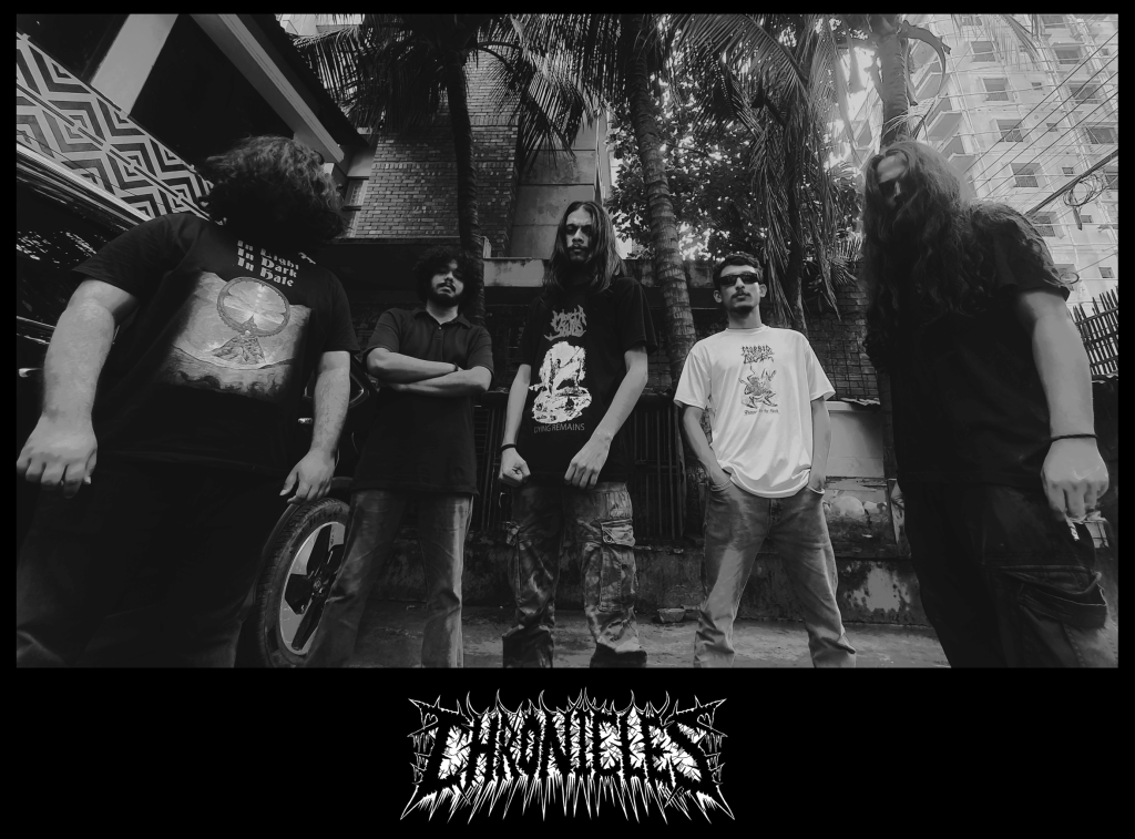Today we have the privilege of sharing a stream of Bangladeshi death metal act CHRONICLES‘ latest demo tape ‘Chaos Cosmogony‘, which arrives today, January 20th on limited Cassette Tape by way of fine Portuguese label Helldprod Records. Expect abysm spiraling death metal presented in raw and real form, a garage burning pyre of occult aggression enacted in real time. Per my review: “This third official release and second demo tape from the band, ‘Chaos Cosmogony‘, makes a strong case for raw rhythmic practicum and the lasting appeal of garage-bound death metal fealty. Without the usual obsession with stylized sound and derivative trendiness it is the occultist death quintet’s horrifying performance and furiously voiced abandon that nails this relatively short burst of song into skull and mind. […] By my own observation they’ve realigned to emphasize their dark arcane spiritual theme with appropriately swords-to-plowshares approach to brutal, riff-obssessed death metal with a meandering melodic aspect buried deep beneath the terror front.” If you are seeking real, tangible death metal from a dark place I recommend setting sights on whereabouts Chronicles are headed with this tape.
