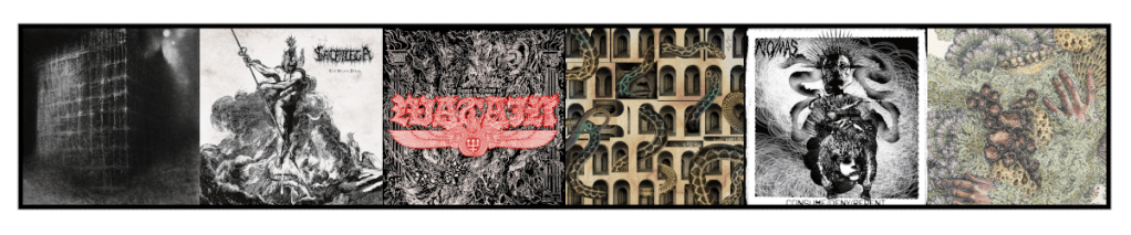 Though I’d initially set ‘The Arcana Spear‘ aside thinking it was a short EP, it’d been a damned glorious surprise to fall into this abyss-guided morbid death metal debut from San Diego-area spawned trio Sacrilega. Formed between ex-members of black-thrashing maniacs Invocation War and fanatical drummer P. (Rights of Thy Degringolade, ex-Sacramentary Abolishment) around 2019 these folks play what could be considered blackened death metal heavily informed by the gray area enjoyed between the two sub-genres in the late 80’s, an echoing and calamitous sound which is immediately characterized by a distinct style of drumming and chaotically sped volleys of riff. The major reference that comes to mind should be pretty obvious if you like Angelcorpse‘s psychotic ‘Hammer of Gods‘ as much as I do, though this band is less directed by exaggerations of ‘Blessed are the Sick‘ and more informed by classic black, thrash, and death metal of a certain bestial order. These guys end up firing off so much energy and riffage to start that the sensory overload hit pretty quick, becoming a maniac blur by the time the ~40 minute record resolved. The who best representative songs here in terms of it being more than your usual bestial thrashing death metal record are “Rites of Macabre” and cursed thrasher “Ode To The Sepulcher Dream”, at least for my own taste. Can’t get to everything in depth this month with so many quality releases but this is one of the best records put out in April.
