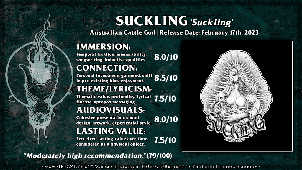 Suckling are a freak on paper and an easy to gel with good time in practicum, there’ll be no way to get around it without resorting to some kind of elevator pitch which reduces their soup down to stink — “Organ jammin’ progressive noise rock n’ roll” will have to do ’til you know better. The electric organ does such work on this album that it manages to be the keystone and the crooked puzzle piece at the same time, a surprisingly effective glue for anxious yet bluesy noise rock shuffle and devotional heavy rock theatre alike and I’d found it beyond entertaining per my own experiences at the fringes of punk, psych and heavy rock permutations. It isn’t an easy recommendation to the general public, I figure you might have to be exactly this weird for entry. A moderately high recommendation.