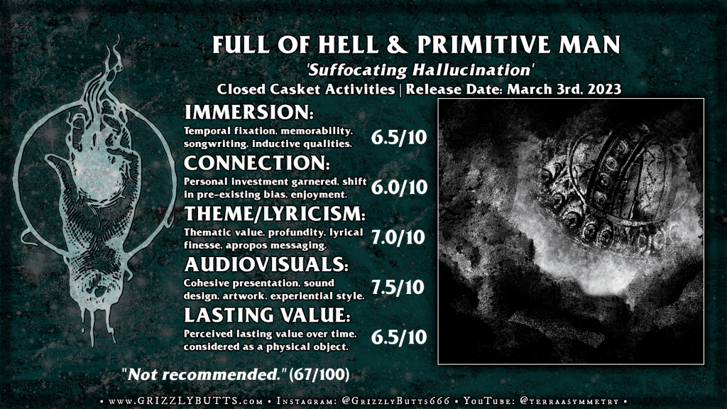 The edgier, raw beginnings of both Denver, Colorado-based sludge metal group Primitive Man and Maryland-based noise/deathgrinders Full of Hell were notable for their unhinged, confrontational and often not so calculated approach early on. I’d been a fan enough to follow what each group were doing for years until it began to feel like they’d “branded” and aimed for consistency rather than something more emergent since ~2016. Now, I get why that’d be a strange comment considering the experimentation with “noise” that’d always been embraced on each side but this sort of thing has been well explored, just as much of an institution as deathgrind or sludge at this point. Collaborations can definitely keep things interesting when they make sense as important interstitial releases for groups who maintain serious touring presence and this is where I’d justify sitting with ‘Suffocating Hallucination‘ a handful of times, curiosity for how things’ll line up and entertaining the idea that these two bands have similar vibes.
