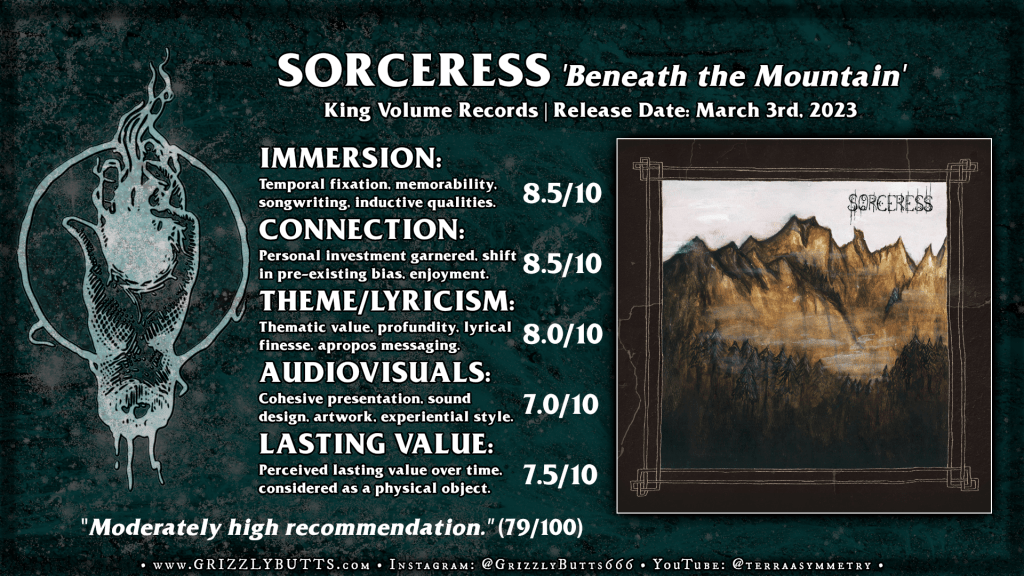 The singular late 2000’s Oregonian export found in stoner/doom metal group Sorceress‘ debut full-length may very well set ’em up to be a name resigned to the early, less extreme beginnings of the folks behind extreme doom metal artists Mizmor and Hell but only ’til you’ve sat with the wild, eerie gloom of this possessed and raw-spirited record. There’d been some proper reminder that it existed a couple of years ago when the CD was reissued independently circa 2020 but now we’re getting a first vinyl pressing here in 2023. There is a particularly fine ratio of witching late 70’s theatre to the blues-tinted timbre of this album, one that is cognizant of the occult rock and throwback doom available to the PNW underground at the time but not cheesily indulgent in past-sightedness. ‘Beneath the Mountain‘ was surprisingly adventurous, or, inspired to create its own morbid atmosphere around the edges without interrupting the greater creep of each song and the real impetus of this is the way “Nine Muses” is conjoined with “…Of the Trees” by a valley of mic-scraping dread and a screech from beyond. Likewise the measured vocal performance from A.L.N. will be surprising if you’re looking back in time, a certain knack for phrasing which eclipses a lot of the Electric Wizard-esque stuff around at the time, gets weird with it and by virtue of going over the top lends a tone of personality to the full listen. Most folks will be itching to grab a record like this after the first few songs, I think it sells itself well enough up front, but make sure you’re up for it getting a lot weirder, pushing into fully psychedelic underwater epics as we step slow and steady toward the title track. Underrated record and an easy recommendation.
