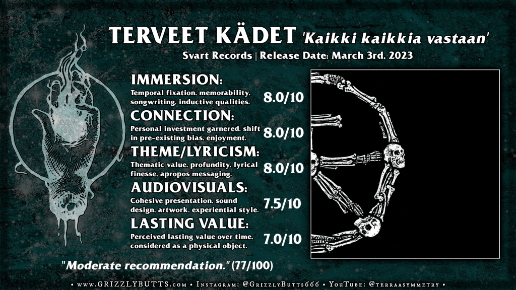 Best known for their influential early 80’s contributions to hardcore punk as one of, if not -the- first band in this style to hit Finland Terveet Kädet are at least one of many important names any Scandinavian punk fan worth their salt should know. Seek their discography yourself, they’ve had a lot of interesting variations to arise since the 90’s, but the one which concerns us most today is the 2015 full-length ‘Lapin helvetti‘ and the thrashcore band Lapin Helvetti who put out a record back in 2017 after this formation of the band split, those releases give a sense of what to expect here: Simple yet effective chainsawing away similar to the band’s 80’s material, something close to d-beat but more broadly sourcing itself from early-to-mid 80’s hardcore punk and even a bit of their thrashing side on songs like “Virta”. Pretty straightforward ask here with 16 songs and just ~23 minutes, a fast burning shout fest which cracks off through its faster/harder burners and eventually seeks greater variation on Side B. They’ve got the right spirit but kind of a fenced-in production sound here with an otherwise good emphasis on the bass guitar tone (see: “Ihmisruoska”) and plenty of speed applied to their gig. Favorite song here is probably the swingin’ Poison Idea-esque “Haaskalintu” with its atmospheric break.