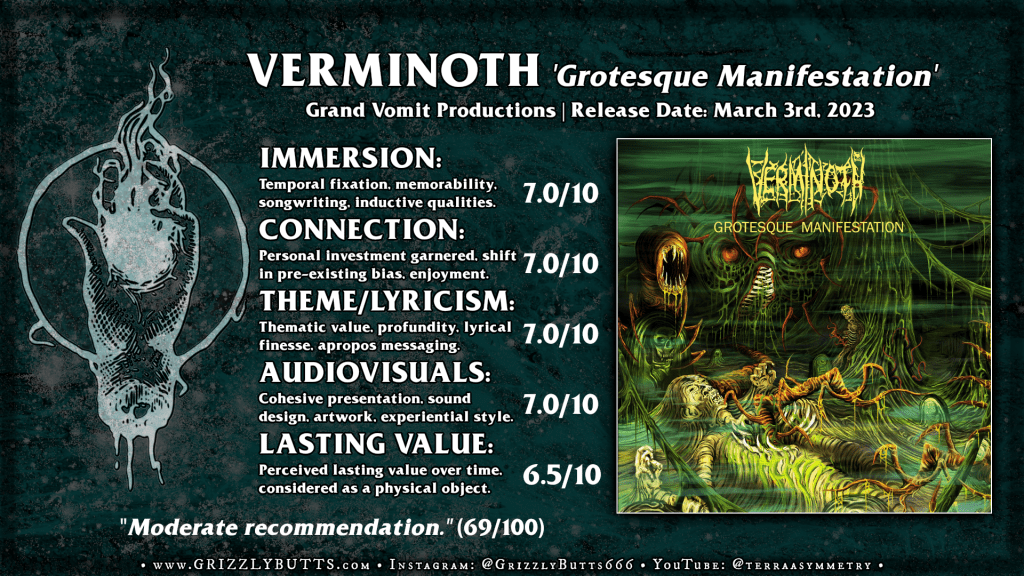 Pennsylvania-based death metal quintet Verminoth bring a fairly approachable blend of straightforward, menacing death metal grooves and slamming brutal death production values on this EP, which follows their 2021 released debut full-length. These guys have definitely pushed out material quick having just formed in 2020 and while most of it is solid in terms of a distinct enough sound the riffs, or, the guitar interest isn’t quite there for my taste just yet. The drum production feels artificial yet appropriately so since their style lines up with the modern slow-motion slam feeling of the record, in fact the brutal thud of it all ends up being the major draw for my own taste as they begin to toss in guttural vocals and change it up over the course of these four songs. This is probably the best introduction to Verminoth‘s sound yet if you’re a newcomer but if you show up looking for the more pinging snare of their full-length this’ll be something a bit different to sit with.