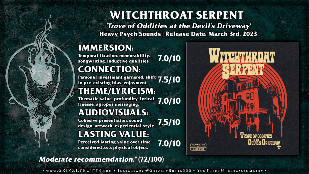 The fourth full-length from Toulouse, France-based psychedelic stoner doom metal quartet Witchthroat Serpent does not stray from their course with its dreary, Satanic imagery and morbid, slow-going style of fuzzed doom. In this sense they still owe a lot to the tradition of bands like Electric Wizard, there’ll be no escaping it, but from my point of view that ends up being a virtue when done right. ‘Trove of Oddities at the Devil’s Driveway‘ rarely stumbles, holding a steady pace and inserting some manner of variety in the guitar tone to keep things interesting (see: “Yellow Nacre”) though I don’t think the songcraft is outrageous or innovative in any sense this is more a matter of doing one thing, generating a mood and drawing up a narrative, and doing it well. My interest in this album is generally weighted towards the first two pieces but closer “Mountain Temple in Bleakness” did well to tie things off with a dizzying groan. Class act if you’re into this kind of thing.