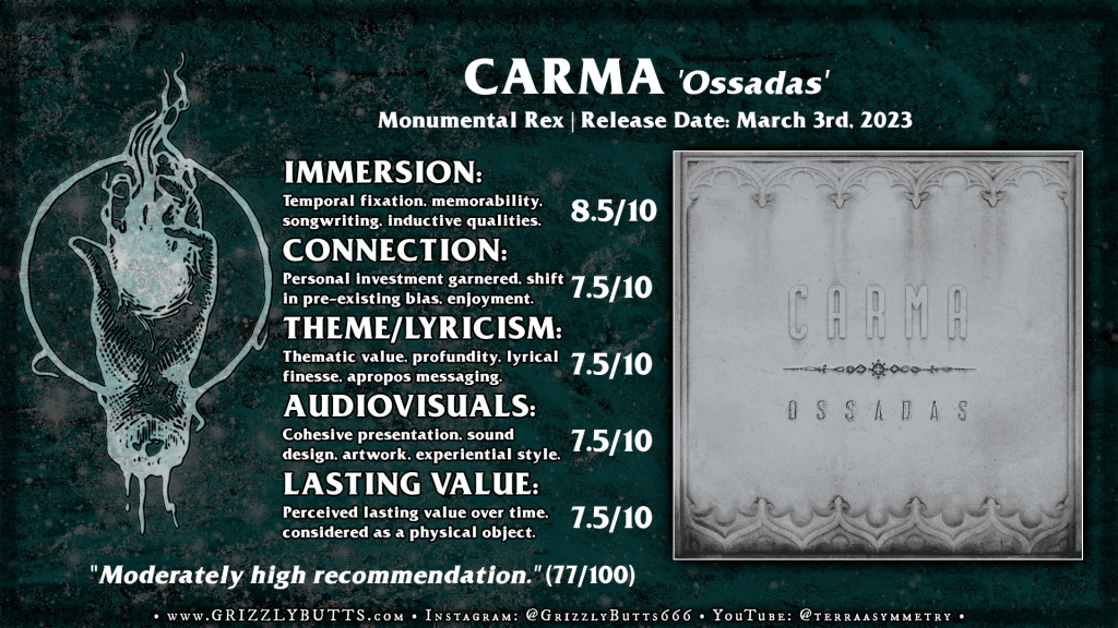 Carma formed circa 2012 between musicians who’d both collaborated or struck out on their own black metal related projects throughout the 2010’s otherwise including Everto Signum, Mandragora Malevola, and Nekromorphine. Of course without some vested interest in the Portuguese black metal spheres these names are either too temporally distant for the magpie black metal fandom today or simply mediocre unknown releases to begin with. No doubt this particular project was on the cusp of something more rarely achieved from the outset and it’d naturally called for more interest in 2015 when their debut (‘Carma‘) released. Blackened death influenced vocals, a couple of extended scene-setting dark ambient passages, and an atmospheric black metal rhythmic tilt all added up to an interesting enough style of funeral doom on that debut but likely nothing mind-blowing for the typical extreme/atmospheric doom metal enjoyer at the time. With ‘Ossadas’ the band expand upon this idea in a far more dramatic fashion, leaning into their dark ambient side to space out their doubly long (~9-10 minute) funeral doom pieces.