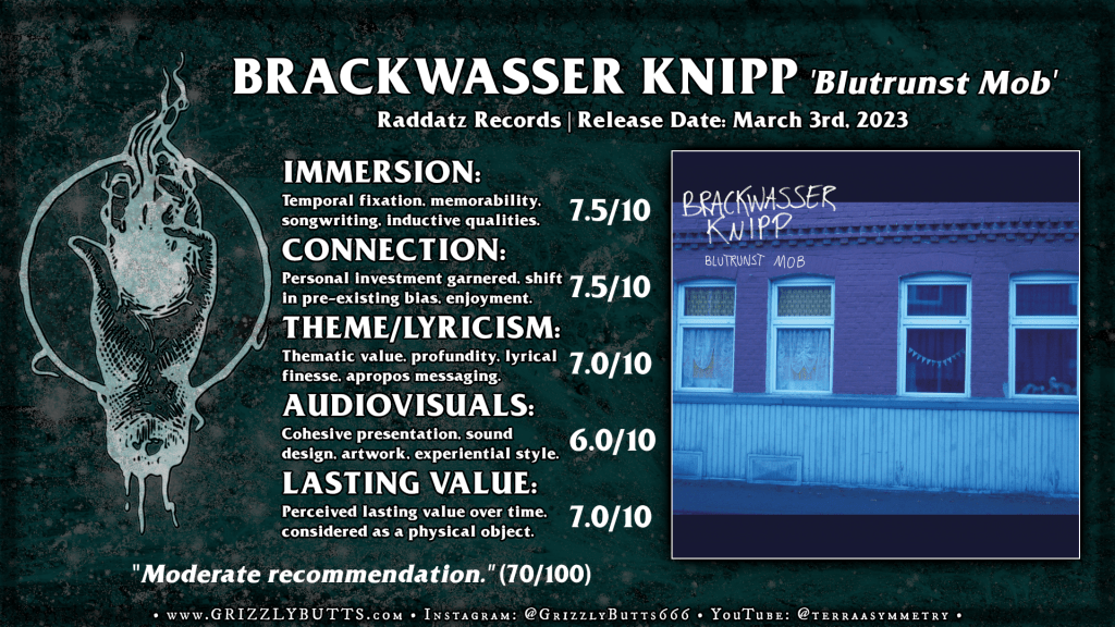 Brackwasser Knipp is a Berlin, Germany based noise rock/sludge solo project from A. Donnermann who continues to play with a sort of Melvins meets math rock bent, bringing to mind the early era of bands like Helmet and Tad thanks to stabs at guitar feedback and layered-but-blunt shouted vocals. All of it plods along at similar pace dominated by a big distorted bass guitar tone and plenty of shouting and this’d allowed for the drone of it all to reek of frustration and sink into its gloomed-out rhythms. The record goes places which should appeal to early sludge metal fans but I figure most won’t get that deep into it due to the bland aesthetic and singular bass-driven voice of the rhythms. Highlights: “Shaolin Mensch”, “Inkognitiv”.