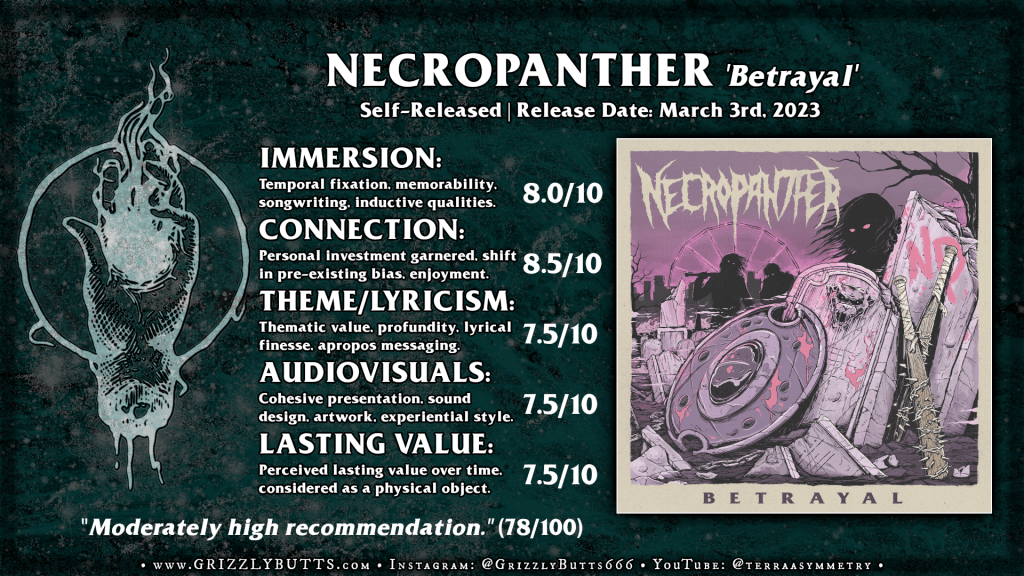 Denver, Colorado-based melodic death meets black/thrash quartet Necropanther continue their thread of niche cinema themed full-lengths with a concept based on The Warriors for this third entry. They’ve not rocked the boat too hard beyond ‘The Doomed City‘ (2019) in terms of aesthetic, sound design, and style though we do find the final result less abrasive in render with the still quite loud (and even more varied) vocals tamed to allow more room for a strong bass guitar tone and plenty guitar detail. Fans of Skeletonwitch and Revocation will quickly appreciate the style of this band for the melodic black/death approach which is still rooted in the commanding wallop of post-2000’s thrash (per the ex-Havok rhythm section) but I continue to appreciate their conglomerated vision as a modern form of melodic death metal prone to rethink the classic approach to guitar harmonies and switch up their riffs between percussive stomp ’til more involved run-based phrases. There is a satisfying, certainly over the top technical flair here which continues to characterize their work yet it takes a while to start cracking into sounds and ideas we’ve not heard before in their previous work, in this sense ‘Betrayal‘ feels inspired yet iterative. Though it took about 4-5 runs to sink in beyond the excitable noise of it all hitting at once I’d felt like this record successfully learned from and boosted beyond the already impressive standard of their third full-length. It is well worth noting this is yet another impressive independent band who’ve put in the work for a professional result with all angles considered — fine/stylized artwork, high production values, etc. while still doing exactly their own thing.