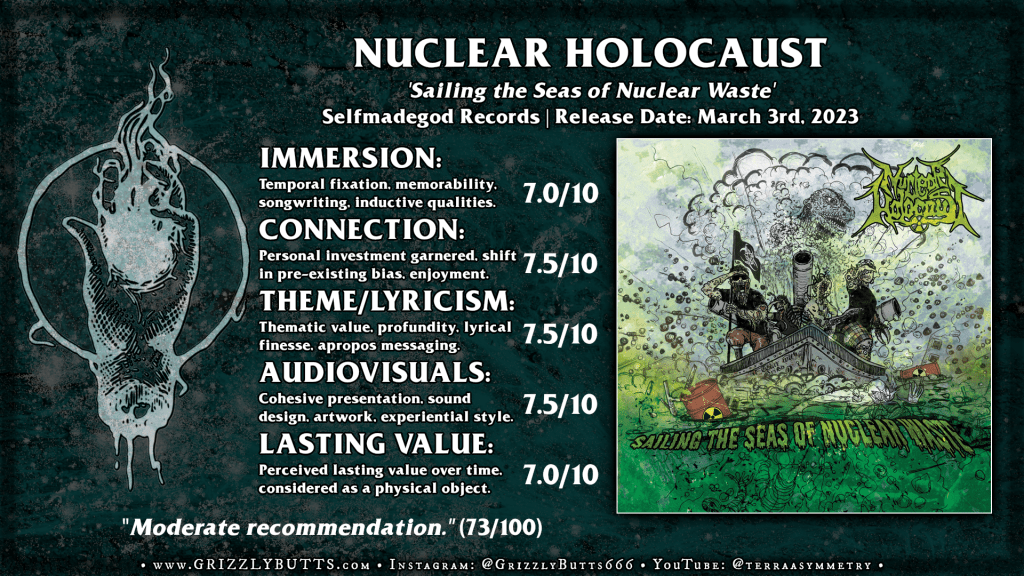 Nuclear Holocaust are an entirely straightforward ‘old school’ grindcore band out of southeast Poland in the spirit of the late 80’s/early 90’s US grindcore thanks to prominent thrashcore and death metal influences. This third full-length maintains a sparse recording, focused on the thrash/hardcore guitar sound and a distant presence beyond occasionally doubled growls of the vocalist. This adds to a classic approach unhindered by the later 90’s amping of production values in the grindcore space which still feels punkish, disturbed, aggressive and naïve in a good way. The only catch is that none of it is all that memorable or varied as we cut through ~25 minutes of single-minded beatings. “The One Above the Mankind” takes a late 80’s hardcore hit and they hit a few blasts around “Like Lambs to the Slaughter” but these guys have aimed for the laser focus of the most classic stuff and the result will likely only get a rise out of classicists looking for the old ways. Nothing I’d flip my shit over but I will definitely keep listening.