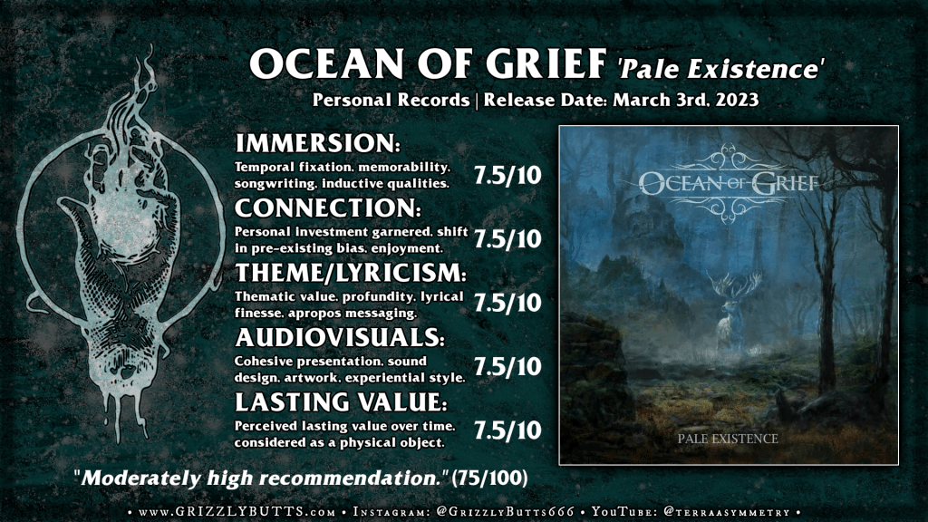 Athens, Greece-based sextet Ocean of Grief offer an entirely classic example of lead-driven melodic death/doom metal on this second full-length. An imposing, sometimes claustrophobia inducing production value is successfully de-weighted by soaring leads and the use of present yet distant keyboards for an effect which feels heavily influenced by the mid-2000’s era of this sound, minus the progressive leanings of the time. ‘Pale Existence‘ definitely has a bit of Saturnus and Draconian in its blood but doesn’t really delve into the gothic spectrum in the way that those bands did at their best, instead the steady semi-melodic death metal feeling of the band carries my interest as a persistent mood without vestigial interruption. The only detractor here is that the leads don’t always direct these ~6-7 minute pieces in any certain direction, meandering one moment (“Imprisoned Between Worlds”) and leading successfully the next (“Cryptic Constellations”). Though I am not sure this is a release that will stand out too heartily in the average listeners ear it will read as a perfect ratio of sombre moods, heaviness and lead guitar interest for the die-hard melodic death/doom metal fandom. Highlights: “Pale Wisdom”, “Poetry For the Dead”.