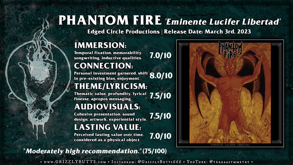 Phantom Fire are a Norwegian black/speed metal band who’ve managed their own unique creative streak between an inspired first single and now two full-length albums. Much like its successor ‘Eminente Lucifer Libertad‘ is a fast burning event rooted in 80’s black metal, daemonic speed metal and this time around a few hits of traditional heavy metal swagger (“Derive From Ash”) which give it a black n’ thrash n’ roll feeling at times. Unpredictable, off-kilter, and pocked with far too many interludes this time around the main duo (plus session work from Enslaved‘s Iver Sandøy) have a devil may care attitude about most of these shorter, more bruising works though there are some obvious standout moments. “De Taptes Dans” fumes with psychotic black metal energy, “Bloodshed” and “Ritual” set up Side A with plenty of mayhemic intent by way of cutting riffs and “Mara” is maybe the last gasp before the record phases itself out. The only real complaint here is that a few big pieces are just there to fill space, “Satanic Messenger” and “Pentagram” are interesting enough and had me thinking I’d accidentally switched over the another record to start but they’d felt entirely skippable per my taste after a few full spins through the record. The overall effect is memorable even if by some strange and ugly means, an “fun” and interesting approach to black/heavy metal ideals either way.