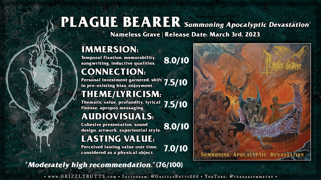 Though Plague Bearer initially consisted of the original line-up of death metal band Drawn and Quartered this bestial black/death group appears to have eventually became the name for a side project which featured pieces that weren’t the right fit for their other band, this record includes ex-Abazagorath vocalist Nihilist. Their style is essentially early 90’s black/death metal with an emphasis on the semi-melodic shaping of black metal riffcraft, something like Lethal Prayer or maybe Prosanctus Inferi. You’ll definitely recognize some of these songs if you’ve picked up any of their demo compilations in the past, otherwise the general muscle memory for their other group is very much there on certain pieces. The string of heavy metal leads on “Under One Sign” stand out alongside some of the more melodic riffing on “Churches are in Flames” and “In Satan’s Name” should be expected highlights if you are familiar with their 2001 and 2008 demos. Maybe I am too familiar with these songs or had been expecting something a bit more abrupt but this one didn’t stick with me from the start. Nonetheless the full listen manages some interesting riffs, I’d felt it all landed a bit sleepy beyond the much more awake accost of the vocals. Good stuff, and I’m glad they made good on a lot of their best songs, but not a great record.