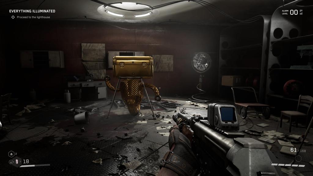 Before we crash land on Facility 3826 and get to work quelling a seeming robot rebellion which has left basically every single human inhabitant excepting three “dead” (we’ll get to that) we can at this point note the first two very big influences I’d posit on this game’s long list inspiration, the first is perhaps obvious in the sense that the alternative history “for the worse” depending on your point of view is immediately evocative of one of my personal favorite games Wolfenstein: The New Order (2011). The second evocation comes within the slow-moving, somehow chatty introduction to P-3 and his talking left hand-strapped glove CHAR-les as they approach the Chelomey complex where Sechenov works, a set of interactive scenes clearly inspired by the opening moments of BioShock Infinite (2013) in terms of pacing and presentation as the world is revealed in an artful way before the player comes crashing down. In many ways we must conceded that this type of ‘immersive sim’ game will never recover from the influence brought on by Half-Life (1998) as we spend the first 4-5 hours of the game solving a long list of puzzles, traversal, and combat challenges throughout a large laboratory, the Vavilov Complex, which introduces myriad mechanics in a reasonable roll-out. There is no lock-on mechanism to allow for strafing and this means aggressive enemies will have you spinning in circles to hit them with your axe to start. You eventually get guns, an electrical spark from your hand (the “Shok” skill), a dash which works in mid-air, a way to scan through all walls, and can use telekinesis to vacuum loot from containers. All of these can be upgraded and from there one could feasibly focus on a build or, on the non-hardcore difficulty, likely come close to crafting all weapons and suit skill upgrades before finishing the game. The introduction to the game, its world building and on-boarding with the interactivity of the world is memorable as it is refined with plenty of curious mechanics to fiddle with, many different types of puzzles to solve, and combat which initially feels somewhat imposing and dangerous enough to kill you outright.