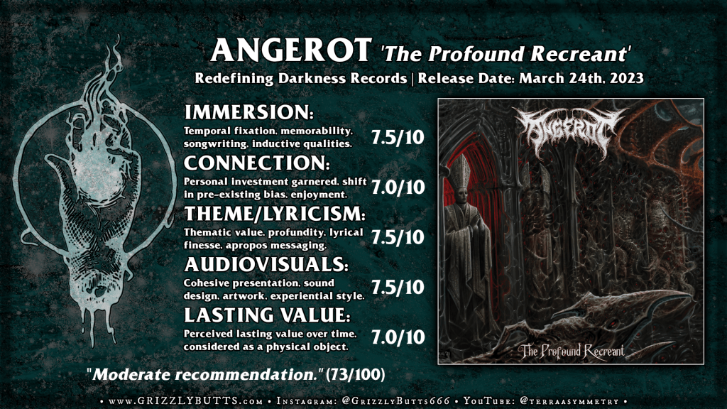 This third time around South Dakota-bound death metal quartet Angerot are going for a louder is better approach on all counts, doing their best to burst out the speaker and make a big first impression upon the listener with their Swedish death metal influenced but Behemoth-engorged sound. These folks have always gone big with each record in terms of getting notable guests, aiming for well-known producers/engineers, and featuring the talents of John Zig on each of their album covers and this’d been an easy in, a best foot forward as their sound developed in a more dramatic direction. Here on LP number three it seems the general flow of the record is slightly askew, the central idea of the band has stalled a bit, and the guest spots don’t necessarily add much to the experience. Their best album cover to date, though. A big part of my gripe with ‘The Profound Recreant‘ centers around the use of multi-layered vocals performed at different registers, all of which arrive at the same cadence and intensity from song to song. This creates an obnoxious, always jacked to 100% feeling with lacks any nuance alongside riffcraft which resigns to a most basic, functional level of death metal rhythm. When the intensity of this style of death metal music is resigned to impersonal vocal layers all firing off at once it becomes unreadable, and I wasn’t up for a ~40 minute spin when the rhythms themselves didn’t pick up the slack. I went in excited for this one, those first two records seemed to be going somewhere, but this time around the experience lacked any truly resonant moments for my taste. Not a bad album per se, just one that’d had me asking “Where are the riffs?” pretty quick.