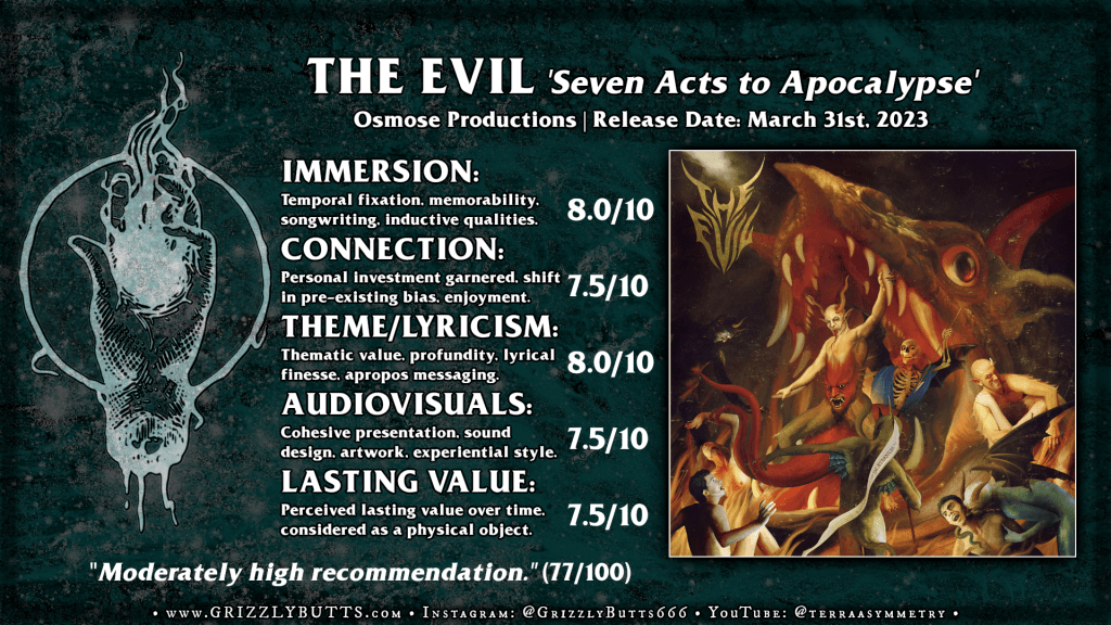 The Evil is a Minas Gerais, Brazil-based doom metal quartet from members of well known rock groups alongside the current bassist for Chakal but perhaps more notably for us the main guitarist here is Wagner Antichrist of Sarcófago infamy. While their 2017 debut was more in the Electric Wizard-esque speaker blasting psychedelic horror/doom metal format this second full-length takes an entirely different direction. ‘Seven Acts to Apocalypse‘ is still doom metal in practicum but arguably in a space between the psychedelic direction taken prior and an ‘epic’ (as in early Candlemass) cadence which lends well to the lightly avant-garde path taken within its operatic presentation. This accentuates the concept of the record, that evil fully rules over this world now, and the seven deadly sins themed lyrics act as ideal foil for new vocalist Mistres Wournous to explore her impressive dramatic range. Overall this is a much more considered, serious feeling record which benefits from the direction of its concept and keeping the average song length around 6-7 minutes. I wouldn’t suggest simply previewing a track or two out of context but rather let the whole thing be a slow burn, all-in-one listen. Highlights: “Greed”, “Sloth”.