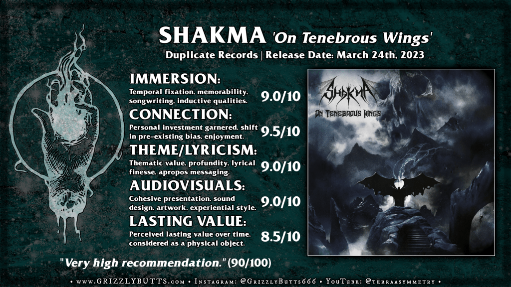Per my obsession with all things thrash metal this is the exact type of guitar music which I most consistently return to for a fast, impressive and malevolent kick of heavy metal and in a very simple way Shakma have checked all of the right boxes for my own taste with ‘On Tenebrous Wings‘, hence the likely surprising very high recommendation and score. A half hour riff-fronted sinister thrasher like this will typically fill my free listening time to the tune of hundreds of listens and this one stuck very well on repeat thanks to the general single-mindedness that drives us through their tunnel of terror bruising fast. Your results will vary based on interest in classic thrash, nowadays Norwegian thrash supremacy, and some of the more extreme edges they push here rather than anything too outwardly tuneful beyond the average shout-along worthy chorus. A very high recommendation.