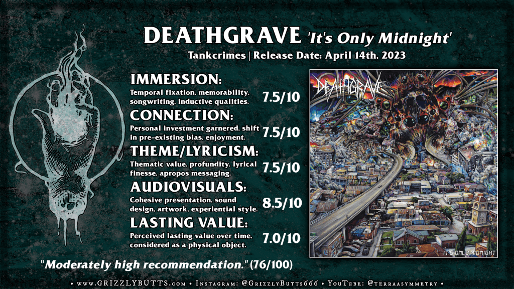 San Jose, California-based deathgrind quartet Deathgrave return with LP number two about five years later and they’ve still got most of that frenzied energy lingering throughout ‘It’s Only Midnight‘. They’ve simultaneously eased off some of their more powerviolence/thrashcore inspired ways and stepped up their heftier, weirding grindcore side which makes for a manic ride compared to the unsteady but still flowing head full of ideas found on their debut. It makes for a less engaging but still appreciably underground feeling deathgrind record that bridges the 90’s and the mid-2000’s states of excess. The main references I could pull from my review of their previous record still generally apply: The grooving deathgrind riffs of mid-90’s Skeletal Earth, the crooked punkish gloom of Abscess, and a bit of an early Earache grinding crossover feeling overall. While I’d enjoyed the energetic kick I’d gotten out of thier previous album this time around I’d found the vocals less imaginative, though I’d appreciated “Lonely Streets” offering a break in the belching n’ screeching elsewhere, and overall this one just kinda dragged a bit for me until the very last group of four or so songs where it seemed to perk up with a few last minute ideas.