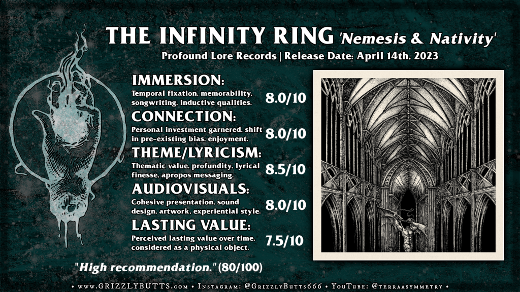 Though their combination of gothic rock vocal timbre, sparse acoustic guitars, scattered yet noisome guitar feedback and post-industrial undercarriage should naturally lead us somewhere nearby peak Rome (for my taste, ‘Nera‘-era) neofolk much of what anonymous New England-based troupe The Infinity Ring does ends up landing a bit disinterested, yet glowingly so. The affect of ‘Nemesis & Nativity‘ initially suggests some pressing statement, a lingering thought waiting to break the surface, setting quite a lot of weight upon the vocal timbre up front yet I’d found the lyricism questionably profound. Even if I’m not buying the melancholia herein that’d end up being the only real gripe to be had with the listening experience, a feat which evolves in considerable ways between its far more accessible “post-rocker” take on Ordo Equilibrio for the masses and the a la ‘Forever Burned‘-era Swans listlessness of the whole thing. Side B will be the decider here for folks who decide to take the full dip. No doubt if you duck out after “Gift of Life” your experience will not be whole as much of the implied post-industrial/folk admixture drains into guitar noise collages and the bulk of the experimental side of the project therein. This shouldn’t be overlooked even if the spectacularly gloomy mood of Side A is a hundred times more compelling at face value.