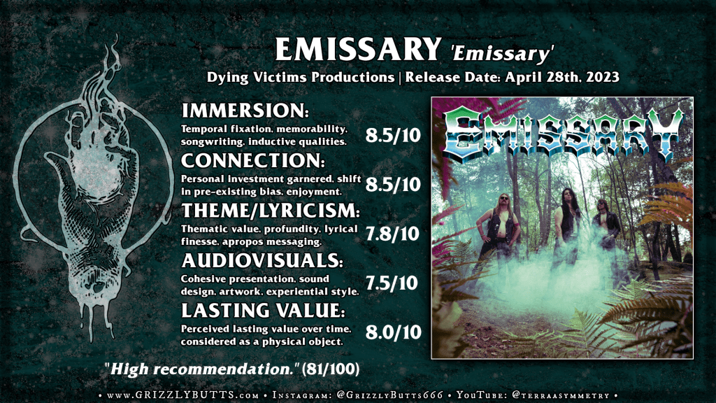 Emissary have begun setting themselves up as of my favorite new Finnish heavy metal bands with this previously self-released (circa 2022) self-titled debut mLP. If they continue along this raw, loud and shuffling-forth 80’s U.S. power metal meets Manowar plus a bit of ‘Burning Star‘ sound I’m all-in. Formed between members of Ranger, Septure, and a former Chevalier drummer. The studio effects don’t add that much to the garage-level noise of the tape (well, this is the vinyl release) but their sound is clear enough to let their moderate use of synthesizers poke through, an important part of their intent going forward as it seems progressive rock and early progressive metal will ultimately be part of the equation as their compositions evolve. They generally keep it ’84 here, no sign of cheap NWOTHM poodle rock here, and I’d particularly appreciated the prominent feature of their bass guitar sound and the absolute grit of the vocalist as he goes for it throughout.
