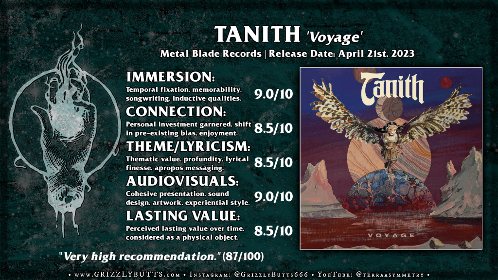 Tanith is the folkish mid-70’s heavy rock side of Russ Tippins‘ (Satan) songwriting realized alongside a choice group of Brooklyn, New York-based musicians and this ‘Voyage‘ is more than just a sophomore longplayer from their troupe, but a full step into realizing the ideal of a full analog process (recording, mixing etc.) It seems the only real wrench in their gig this time around was the sudden exit of their second guitarist, a key proponent of their Thin Lizzy influenced approach to building harmonies which has long been a major signature for Tippins‘ guitar work. Nothing was necessarily lost from the experience, they’d found a second guitarist for these sessions and this album quickly proves their approach has only become more tuneful in the last four or so years since the acclaimed ‘In Another Time‘. Beyond the walking and jogging paced hard rock shuffle of ‘Voyage‘ once again makes full use of the harmony-rich dual vocal performances shared between Tippins and bassist/vocalist Cindy Maynard and from my point of view elaborating upon those possibilities is the major goal of this record. Otherwise the analog recording and render is brighter than prior records from the band and this especially warms the harmony focused voicing of the band to a bardic hum, which feels just a few steps beyond the late 60’s folk rock storytelling and into the more oaken side of groups like Rush and Uriah Heep. The record is a bit long for how involved its many moving parts are but each song finds its place, or some memorable wing to flap about with.