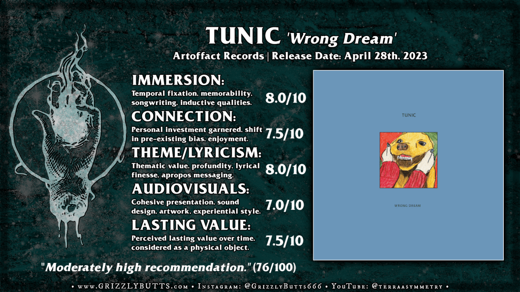 Why haven’t I covered noise rock/post-hardcore records in a while? Bad album art is certainly part of the equation, to start. Just don’t be so “ugly“, eh? While ‘Wrong Dream‘ ain’t pretty per my hifalutin fancy Manitoba, Canada-based trio Tunic have continued to fiddle with their focus on the stark, existential mathematica of noise rock’s motoric rhythms and the jangling strike of circa ’79 post-punk influenced harass making for another half hour of pure dread for the concerned polis. That worrisome diarrhea you get when you think about losing yourself into work that doesn’t represent who you are? That’d be the intent as the lyrics herein take on the “machine part” life, the cog in the wheel you embody, and the grinding away of the self that comes from the work week among other increasingly personal subjects. If you are as big of a fan of USA Nails as I am you’ll hear a bit of their ringing atonal guitar scrambling (see also: “Whispering”) and cold-shouted drive on standout single “Disease” but this is a tonal apex where frustration mounts, it isn’t all heavy lifting. “Protected” kinda shows us both sides, the wriggling gloom of their slower paced, mounting dissention and the release of that tension in its final third. I’d really enjoyed this sea change beyond their more math rocking/post-hardcore ballooned debut overall, the aggressive/frustrated grind of the band only improves per my own taste. What I’d like to hear much more of otherwise is this weird ass post-punk experiment of “Indirect”, if they’d had eight or nine tangents that all felt as different as that, I dunno it’d implied Tunic could stretch themselves a bit more and subvert the singular voice of their gig a bit. The score would be higher if there was like, I dunno, a big goddamned dragon on the cover or whatever.