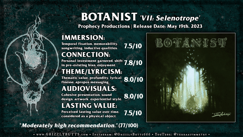 The wholly instrumental, drum void transition into the third act by way of title track “Selenotrope” is generally where ‘VIII: Selenotrope‘ catches my attention most and only briefly holds it within the strong rhythmic station of “Sword of the Night” after that, it being the major standout moment for my taste before the final ~15 minute closer. Much as it would make sense to go into the details of these pieces and parse just exactly why they are effective beyond post-rock’s rhythmic tropes I’d found it made more sense to appreciate just how impractically sophisticated and detailed the work of Botanist manages to be despite the somewhat accessible result, there are certainly simpler ‘easier’ paths to these rhythms yet the logical takeaway is that the mode of instrumentation and the process itself remains the signature of the project more than the melodic engagement available; Despite wanting something as dark as ‘III: Doom in Bloom‘ in this level of a high fidelity render I did eventually appreciate the unique lilt of ‘VIII: Selenotrope‘ as a complete thought, an exploration of the lighter post-metal voicing touched upon within the Collective records while still relevant to the style of the earlier Botanist solo albums which narrowly escapes a wholly whimsical, or, overly sentimental voice. With time and a bit of repetition I’d eventually found the first three pieces alongside “Selenotrope” b/w “Sword of the Night” were all strong enough to warrant some level of a recommendation to the established fandom. A moderately high recommendation.