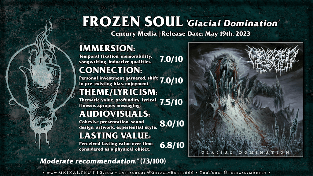 Sounding a bit like a Colin Richardson-juiced version of Bolt Thrower by way of beatdown/metallic hardcore circa 2003 in terms of sound design and their consistently mid-paced plod the way ‘Glacial Domination‘ kicks off is inspired enough as Frozen Soul‘s guitarists tear into rousing opener “Invisible Tormentor” and from there they just kinda… slow down and stick to what they know beyond a few interesting harmonies. The spin is pretty damned thick here between their insistence that they’ll change the very landscape of death metal (?) while also referencing death n’ roll (?!) in truth this album directly iterates upon the first, smartly leaning into their metallic hardcore foundation and of course this is what their fans want: A general software update. While the rhythms won’t add wrinkles to your brains they remain functional and the result is still generic for my taste. As we approach the Amon Amarth bounding quasi-melodeath stride of the title track Frozen Soul have more-or-less revealed their hand, still kinda doing the ‘Perseverance‘-era Hatebreed tinted death metal deal with a bit of mid-80’s horror synth to tie all of the disparate pieces together. Eh, its just alright, the whole thing definitely sounds pro but the full listen is overly long at ~47 minute and the big step-up implied here never quite happens as the second half of the album slugs out. There are a few potent moments which’d stuck in mind: The Obituary-sized rub of “Arsenal of War” and the semi-melodic weave of the title track + “Frozen Soul” generally amount to some of their best work, or, a direction they should definitely follow once they’ve worn out the breakdown thickened bop of their gig.