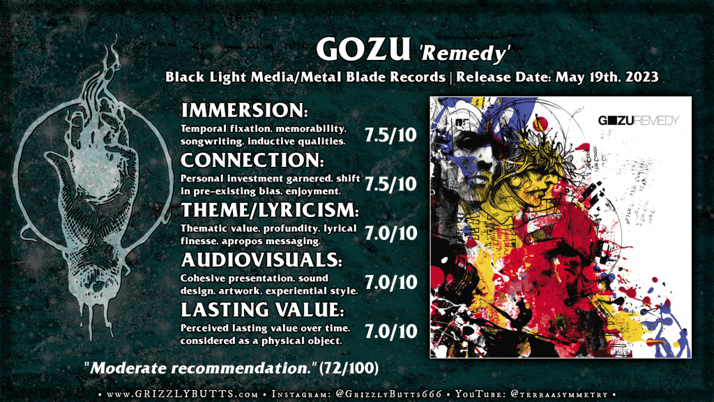 Southern rock, stoner rock, alternative rock, grunge… Boston, Massachusetts-based troupe Gozu have put in enough time on the road and gotten their not-so self-serious selves in order to the point that whatever admixture flops out on the table has an audience in the stoney heavy rock attuned ear. While that competence of performance and a generally resonant sense of confidence is their greatest strength live on record this particular release has a bit of a rock-salad approach, almost reading like an ADHD wonderland for 90’s alternative/hard rock by way of a mountain-ready stoner rock/metal gear which speaks to a feeling of either flippancy or uncertainty from my perspective. You’ll get a bit of ‘Dirt‘-era Alice in Chains tinted feeling within opener “Tom Cruise Control” as they ride out strong with big jogging riffs and darker interjections but that’ll only be the first of several pieces which take a ride toward the loosest, most celebratory side of groups like Monster Magnet and such (see: “CLDZ”) through the use of vocal harmonies and bigger riffs. At that early point in the full listen Gozu make a serious case for their gig without necessarily defining it, setting the bar for energy and harmony-enhanced songcraft high. Granted there is a plenty more left on the plate and I’d found it was all too much as the second half of the album began to grind gears and unsuccessfully adapt its tonal reach. The level of polish achieved here nonetheless gives the record some considerable heft, a big dynamic outing and a best face forward which couldn’t remedy the feeling of hitting “Ben Gazzara Loves No One” and “Ash” and finding it all a belabored conversation as the vocalist leaned into a more listless tenor atop heavier, slower rhythms riffs and began to pull me out of it. On repeated full listens the album surely had its singles, its standout kicks and sly moments in terms of songwriting and performance but it’d ultimately hit me with one or two big blips on the radar and a slow fizzle out.