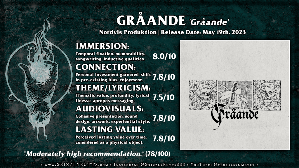 This self-titled debut mLP from Gråande, a new project from Swedish musician Nachtzeit (Lustre) doesn’t step drastically outside of his signature sensibilities in the sense that it is deeply atmospheric and given melodic voice per will o’ wisp level synths yet it finds differentiation in tone as ‘Gråande‘ intends ominous ambiance, a dark corridor ahead which is explored slowly, peeking around cold stone columns for what lies ahead. The project also includes vocalist/lyricist Nichil who has collaborated with Nachtzeit on at least one other project in the past. The full listen reads a bit like an intentional combination of ambient black/dungeon synth and droning atmospheric black metal, picking up a bit of speed in each composition but never shocking loose of the trance that each of the two longer-form pieces create. “Evighetens Kvarn” is the more insistent of the two songs with “Sjöar Ovan” being a gentler introduction to their idea, banking on its engrossing lilt more than anything else. Ultimately I’d found both parts essential in combination though when I’d left the full listen on repeat I’d found myself anticipating and readying myself to get back to the “Evighetens Kvarn”, not that I’d favored it more but that there is some pleasure to be found in breaking through to the more kicking side of things. The ratio of droning negative space to action could be tweaked slightly but the effect was brilliantly immersive nonetheless.