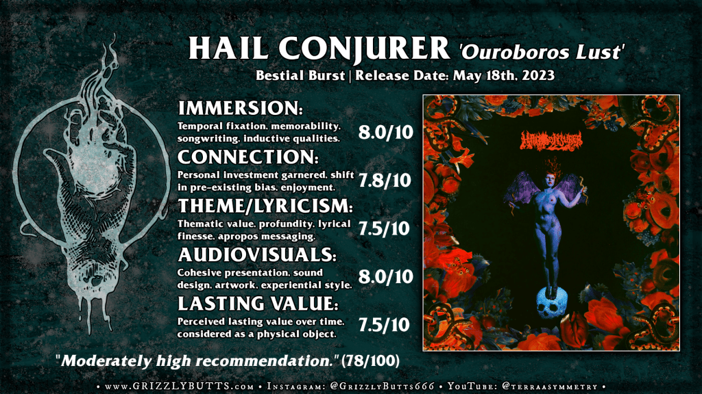 Finnish experimental black metal project Hail Conjurer return with LP number seven and this time around the maestro is channeling Asmodeus, Hedone, Akka et al. in this pensive midsummer stroll through daemonic romanticism, or, I suppose eroticism which does not lose the noisome realism of his craft but gains a differently sombre trait in motion. Still a crawling, rasping beast capable of barbaric acts there is a delicacy to the undertones of these movements which are most obviously felt on opener “Scarlet Gate” but also in the shambling, tragedian doom n’ blast of “Two Stars”. Still gifted with a knack for the sandpapered grate of ancient black-psychedelia and a sense of ritual in hand the Dionysian madness of the project is not lost but this is perhaps one of the most tempered, thematic and deeply considered releases from the artist to date and as such I’d found myself listening on repeat even more than the already brilliant, praise-worthy ‘Earth Penetration‘. Despite this focus we do get a sort of explosive collapse in the final act of closer “Lustful Gods”, so, don’t go in expecting anything polished or commercial. I’d also offer some praise for the value of Hail Conjurer‘s creations as they become increasingly impressive in their audio-visual themes/curation, in this case bringing an electric color palette to an occult boudoir session which only enhances the still very “black metal” feeling of the record. Swords, cocks, haloes, and fishnet all feed into the emergent passion driven nature of the beast.