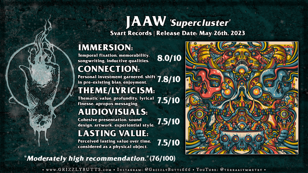 London-based post-industrial/experimental rock quartet Jaaw notably features the instantly recognizable Andy Cairns of still-active Therapy? alongside co-vocalist and visionary Wayne Adams (Petbrick, Bear Bites Horse Studio) who are joined by members of KLÄMP and Squarepusher for this captivating, experimental and generally on-a-tangent debut full-length ‘Supercluster‘. It isn’t that anything goes here so much as they’ll try anything at least once, if it ends up working it goes to tape. It means most of this record avoids sitting in one place too long as the possibilities stretch from unearthly Jesu-esque post-metal, 90’s styled obscurant industrial rock dread, death metallic punk, elektro-dissonant noise rock and Lightning Bolt style break-beaten Bjork covers. That eclectic sense doesn’t come with pretension so much as it feels exuberant, energetically delivering a big fuss, a remarkably colorful stew of sounds which’ve been curated by Adams to some brilliant degree. In some ways I see the “whatever sticks” ethos of Petbrick here in this approach but in this case it means a relevant glom of post-industrial music’s broadened definition. Standouts: “Reality Crash”, “Total Protonic Reversal”, “Hellbent on Happiness”.