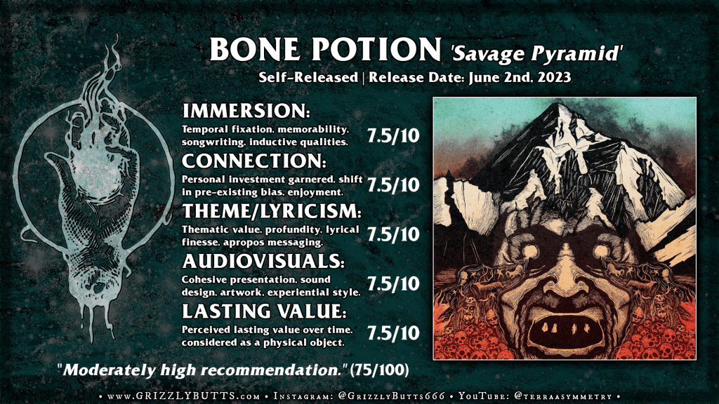 Bone Potion is a Maryland-based psychedelic doom metal project from musician Dave Kezer who has themed his first three singles/EPs around mountains, their worship and the riffs they inspire. Breaking out of the jammed escalation of the previous single into a memorable, neatly formed doom metal meander the title track here has a bit of a Candlemass-esque saunter in its lead-driven steps while otherwise buzzing with growled vocals and cold-stamping verses for a stoner/sludge touch upon the piece. What’d appealed to me on their previous single still stands, the riffs take us there with a bit of a gloomed-over narrative and the lead guitar work carries the experience up to that cloud level and seamlessly into the second half, “Ancestral Magnetism”, just as well. The artist’s knack is clearly there in terms of the guitar work pulling serious weight and each of these songs are memorable and inspired so I’m left even more thrilled to see where they take this sound.