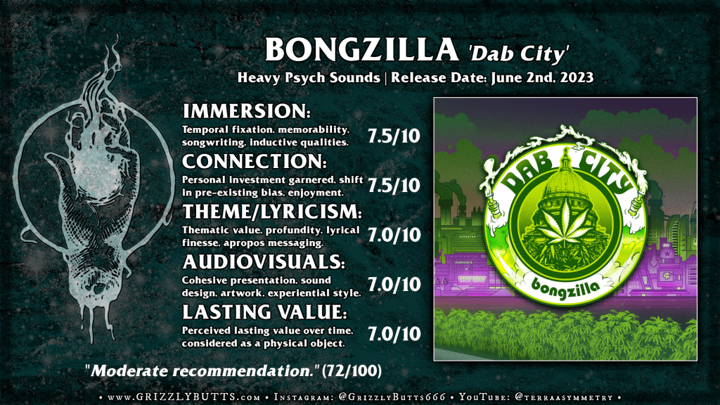 If you’re about my age you couldn’t have missed the print media push for Bongzilla by way of Relapse Records during sludge metal’s initial heyday from the mid-90’s through the early 2000’s but that doesn’t mean you’d necessarily have taken the plunge into their discography. Without a doubt most of it is samey, big honking sludge/doom metal grooves, songs about weed which feature frequent interruptions from samples (a la the grindcore of the era) and throatier vocals a fan of Grief or Buzz*ven would still appreciate. The big record from their initial four LP run is arguably ‘Stash‘ (1999) for my own taste, just because it speaks to an era of sludge I appreciated most when growing up but most folks know ’em from their last two records before taking a fifteen year hiatus. When these folks returned their new reality was more interested in jam sessions, or, even more freeform songs than they’d been dabbling with in the mid-2000’s and so far this has yielded two next-era full-lengths which center around the subject of home, Wisconsin, and their appreciation of the weed that grows there and gives ’em stories to tell. If you’re looking for classic Bongzilla, this record is absolutely it to the point that any extant nostalgia banging around in your head will be thoroughly activated. The raw and hissing vocals alongside big stoner rock/doom metal grooves still does it for me even if it isn’t anything new.