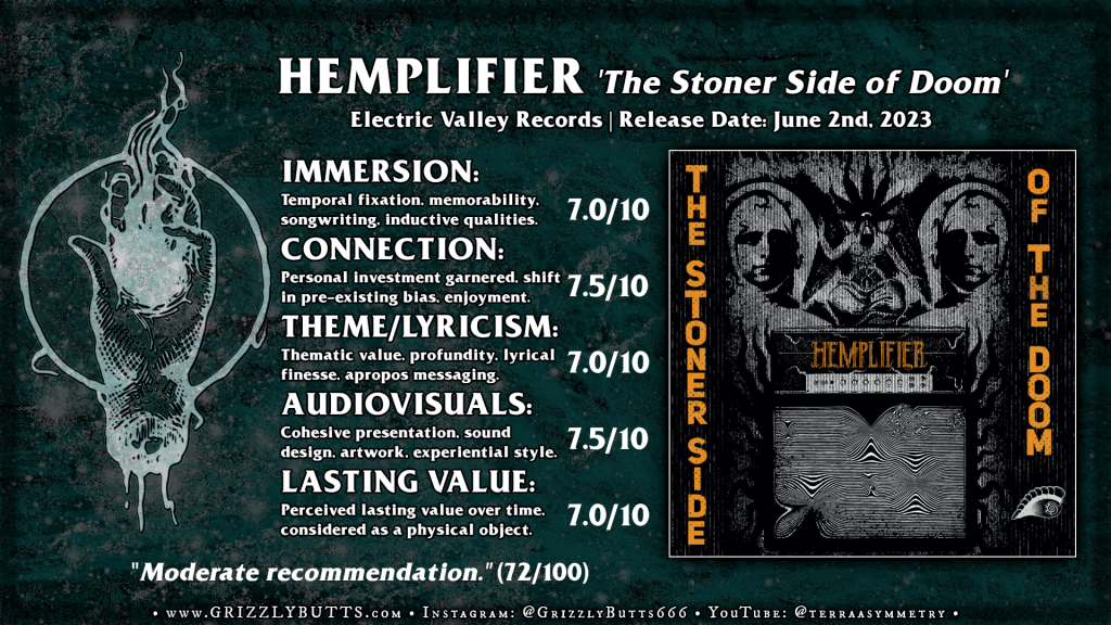 Hemplifier is a more recently formed psychedelic stoner/doom metal band from Malta who focus on eternally simmering slow motion grooves per the early 2000’s school of Sleep. Things kinda witch up a bit o’ gloom when the vocals do finally kick in but they’re mostly horsing around rather than curating a serious moment, at least from my point of view. The effect of ‘The Stoner Side of the Doom‘ perhaps intends to be meditative but ends up feeling funereal, dirging along tunelessly for eight minute blocks of time with the occasionally bellowed sludge growl or spastic break in the rhythms and interestingly enough this does actually go somewhere: Near the middle of closer “Weedcraft” we get a legitimate early Cathedral-esque moment before the piece just kinda jogs out. I’m not dogging on their work in the slightest here but take a deep stare at that album cover, it ain’t supposed to be deep or profound, eh. A good time with potential for a great time with a bit more focus on songcraft.
