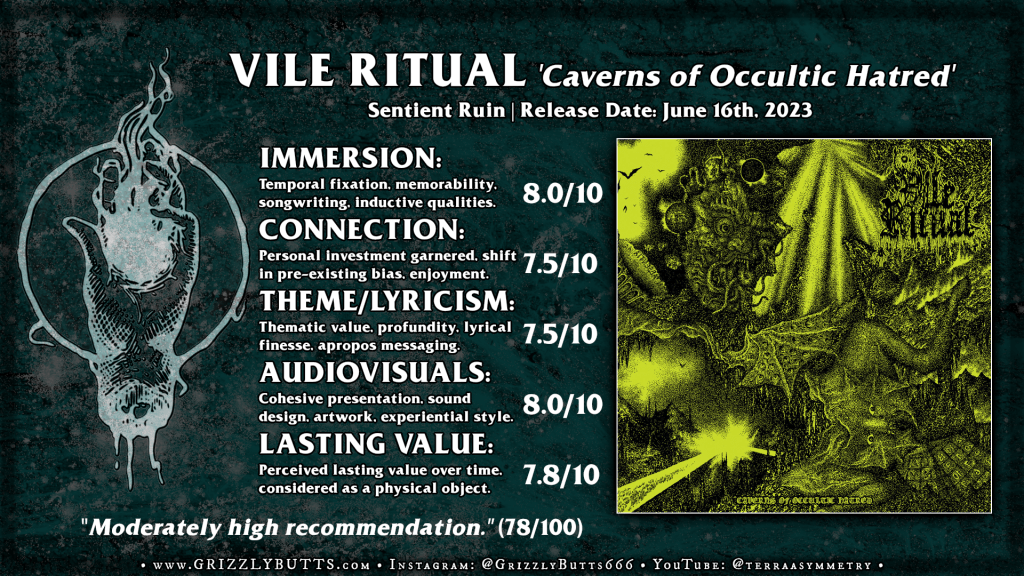 Maryland-based blackened death metal act Vile Ritual is a solo project from musician L.M. who is best known as the guitarist for crossover/thrash group Ninth Realm. Though the artist clearly carries some of that chunky modern thrash movement in his muscle memory the intent here seems to be ‘old school’ death metal influenced riffcraft which has been rendered obscure per some bestial death metal traits, such as backward-echoing growls and tripped-into blasts. The obscurant effect of the music isn’t all that pronounced to start but with song titles like “Formless”, “Void” and “Aimless” the intent seems to occasionally line up with the psychedelic and bestial traits one might expect from a group like Black Death Cult to some degree with a lot of the intensity of the music coming from piled-on vocal effects and bigger atmospheric death metal riffs (see: “Chapel”). Though I’d initially felt this was a cast-off side project the amount of layers and general detailing applied to these pieces and their coldly echoing voicing became more convincing with each listen. I’d particularly enjoyed the subtle use of keyboards on a few pieces, loved the spaced-out break in “Aimless”, and overall I’d preferred the less chaotic riff oriented death metal songs. The oeuvre in hand is impressive somewhere in-between bestial death, caverncore, and a nowadays death metal stomp though I think the thing that was missing on my end was some manner of deeper distinction beyond plain echo-assisted vocals and mashed at creeper rhythms.
