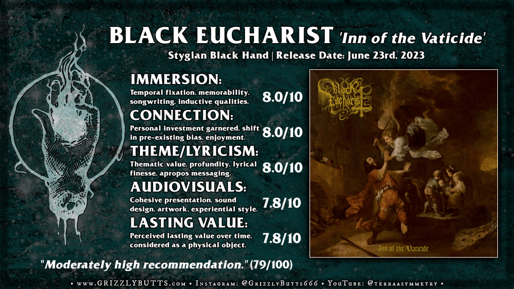 The real depth of this record hits within its second half and this’d been the main reason I’d ultimately considered it a grower. That isn’t to say that Black Eucharist don’t show you what they’re all about up front but that what develops along the way only becomes more engaging with its rhythmic interest. No question that “A Foul Stench Lingers at Peor” feels at least a few steps beyond the opening moments on the album in terms of its development even if they are grinding away at the same pulpit throughout. Seamless performances, wrathful attack, and even a few memorably set songs make this debut worth some considerable buzz for the USBM classicist who appreciates the death metal adjacency of the form while also hungering for an evolutionary event which isn’t saccharine, faux sentimental or forcedly raw. Though it isn’t anything entirely new for the traditionalist headspace it is an especially fine version, a lucid and approachably invigorated vision of blasphemic black metal aggression which is a crucifix-stuffing pleasure to sit (with) and spin on repeat. A moderately high recommendation.