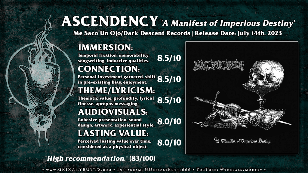 As the second of three short releases which thematically construct a narrative of empiricism conscious of the pratfalls of ambitious conquest one might find it necessary to check back in with the previous release to grasp the events that’d given rise to the before digging into this release’s task of detailing the reign of said empire before the proposed third act, a horrendous betrayal, is readied. Any band offering a conceptual narrative for the invocation of their early work risks taking a leap of personal development in the midst of several years worth of releases and in this sense we do find ‘A Manifest of Imperious Destiny‘ far more refined in its production values and experiencing a deeper than expected bout of change in its tone. Now we can fully shake off that “primitive” black metal preconceived notion and approach Ascendency for the deeper well of phrasal rhythm guitar ambition that it is.