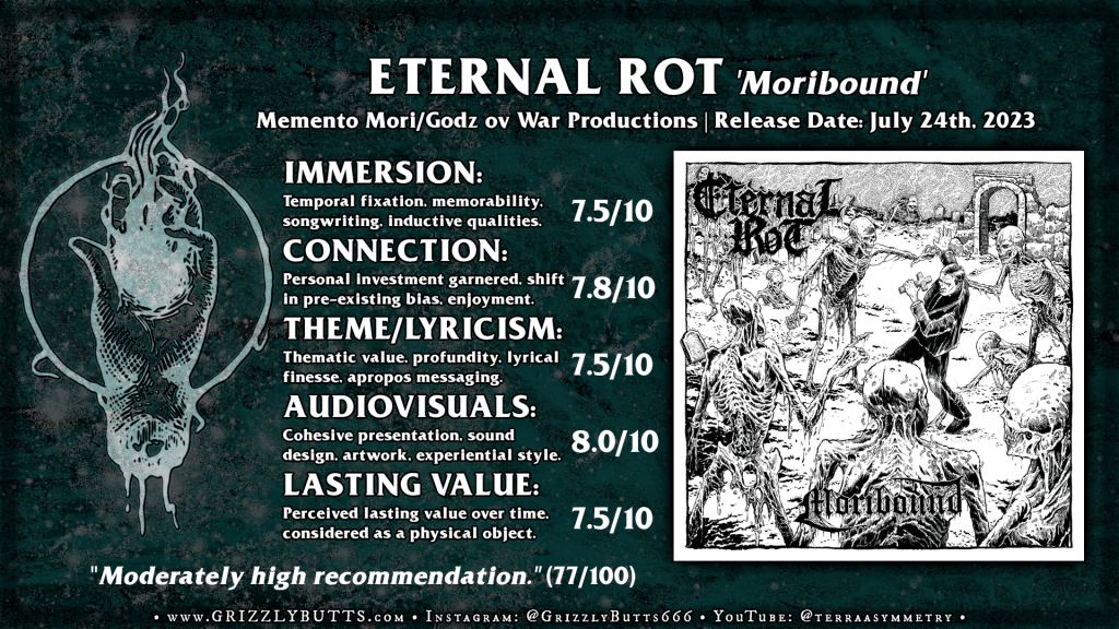 Despite being an even more unfocused, putrid-as-fuck coffin slosher of a record compared to their last two I didn’t end up connecting with U.K./Polish death/doom metal trio Eternal Rot‘s latest full-length. Their kinda stoney, hypnotic doom metal riffs are still the strongest point of leadership on ‘Moribound‘ and the guttural, effects-splattered vocals still have some irascible zombified charm left to spew but I’d never found that one song, or riff that’d kept me engaged or coming back to the experience. That said I enjoyed the echo-heavy psychedelic horror-warp that they’ve grimed up the experience with and I appreciate just how over the top they’ve gone with the vocal treatments to the point that the album creates its own vacuous atmosphere, somewhere in between earlier Hooded Menace and Rigor Sardonicus. Before the homespun horror-surrealism of the project was rad but at this point it sounds like they’re ready to go for something kinda, I dunno, death n’ doom n’ roll judging by “Swollen Corpse Abduction” and “Gestures Never Recalled”.