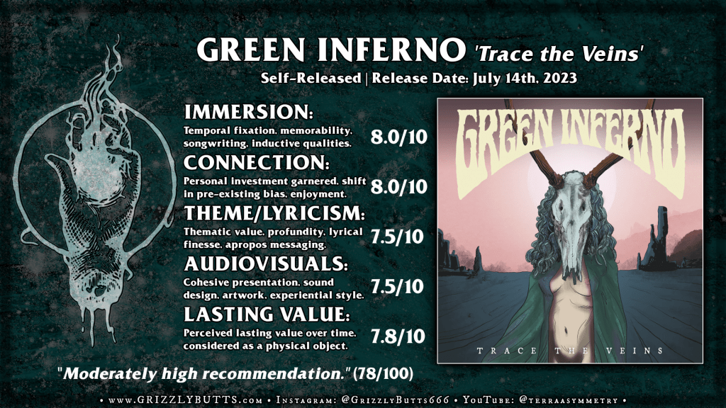 New Jersey-based trio Green Inferno are a bit more my speed, dirt slow stoner doom metal with the right level of sludged-out swagger to their riffcraft and a subterranean sound which emphasizes harsher vocal treatments. I’d appreciated the the “brutal stoner doom” tag applied to their gig, it more-or-less fits the basement-suffocated production values which plunge the ear down to a low-frequency only realm with just a bit of a burnt edge. While the whole thing is growling underwater groove ad infinitum there are a some bigger riffs, a few change-ups in pace and an almost early 90’s sludge feeling to their distinct sound. The sort of band you probably need to catch live to see if they’re actually that heavy and blunt with their damage. Didn’t like the album art but otherwise I think this is a great start and a nice step away from the usual sonic excess. Highlights: “Vultures”, “Spellcaster”.