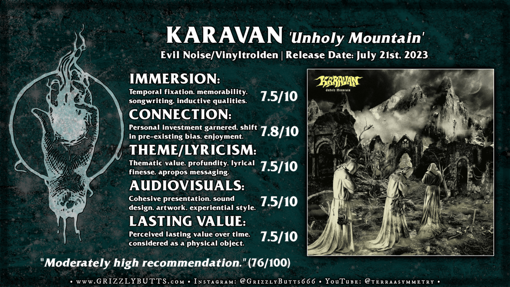 Jæren, Norway-based psychedelic/stoner doom metal band Karavan technically released this debut album back in early June (on cassette and digitally) and since the vinyl release date seems to be unconfirmed I’m not sure what the July 21st release date pertains to. Normally that sort of confusing, incomplete information is reason enough for me to overlook a record but in this case I’d enjoyed ‘Unholy Mountain‘ enough as a casual listen to recommend it regardless. Judging by the title of the album and, well, their jammed-at style of stoner doom they’ve taken the pillar of Sleep and that basic shamanic groove and applied their own harsh edge to it with snarling vocals, a very strong fuzz-crushed guitar tone and made hypnotic and occasionally kicking psychedelic doom of it. Their work doesn’t stray far enough from the archetype to catch heads who’re looking for something exceptional or profoundly different but they pull of a pretty solid slither, scowl n’ groove which’d been a pleasure to spin each time I’d picked it up.