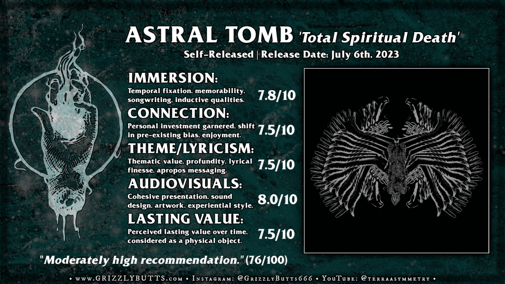 Astral Tomb officially formed circa 2019 beyond a brief stint as Ring Nebula and went at it pretty hard per a roughshod start having worked through the demo process, swapped roles here and there while generally feeling out who they were beyond high school age weirdos looking to make heavy music. The post-2020 line-up seems to have fit best and ultimately yielded a sloppy promotional demo (‘Degradation of Human Consciousness‘, 2021) and a debut LP (‘Soulgazer‘, 2022) which’d refined and clarified the idea just enough to warrant putting it to tape. The description I could launch at that debut in review was loosely an avant-garde/progressive death metal influenced jam which ventured into slam, hardcore, post-music as it reached for disembodied dramatism and emotional outbursts which approximated the sensation of prog-death sans any real skill involved. That first album didn’t necessarily work for me for the sake of its tonal deafness, muddled timing and shoddy musicianship but I’d been impressed with the amorphous character, the adventurous psychedelia-imbued spirit of the band as they reached for an emergent feeling. Even if they’d admirably resembled post-structural idealism there was no real payoff in terms of profundity and from my point of view this is the only real ‘ask’ on my part going into ‘Total Spiritual Death‘, that it arrives with some clear enough meaning attached and for sure some improved musicianship in hand.