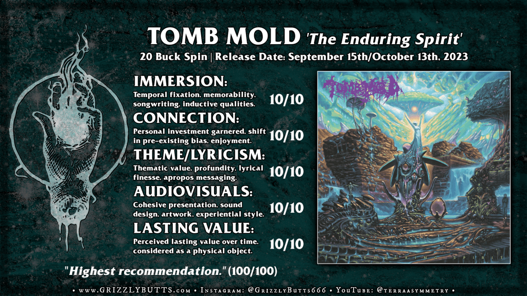 Maybe that’d be the most important point to make, the classic progressive death metal feeling of this record isn’t a trite imitation or vague set of referential events but has curiously evolved into a weirding but eminently listenable coral reef of interest as it whips from densely packed world-class bounding tangles of forms to beauteous points of reveal. The knot of it all eventually unties itself and the greater hum of the record makes good sense as a leap beyond the dark chest-burster that was ‘Planetary Clairvoyance‘. In my case it helps that I’ve long been a huge fan of progressive death metal and its many weirdos and outliers, loving the personal introspective meta-touch when applied to death metal that speaks to skills that stretch well beyond moshable caveman gunk, and with more to say than wanking kata-style fretboard exercises. This release would be exacting to my taste even if it wasn’t from a band I’d been an overdriven fan over prior. After just over ~three months spent pouring over ‘The Enduring Spirit‘ and containing a summer’s worth of reactions it is fair to say that this album has incredible depth, a work which bears a lasting and repeatable sense of inspiration which now appears daunting in execution and effect next to Tomb Mold‘s past work. An immense work and likely a gaze at Particle 010 for those similarly inclined. Highest possible recommendation.