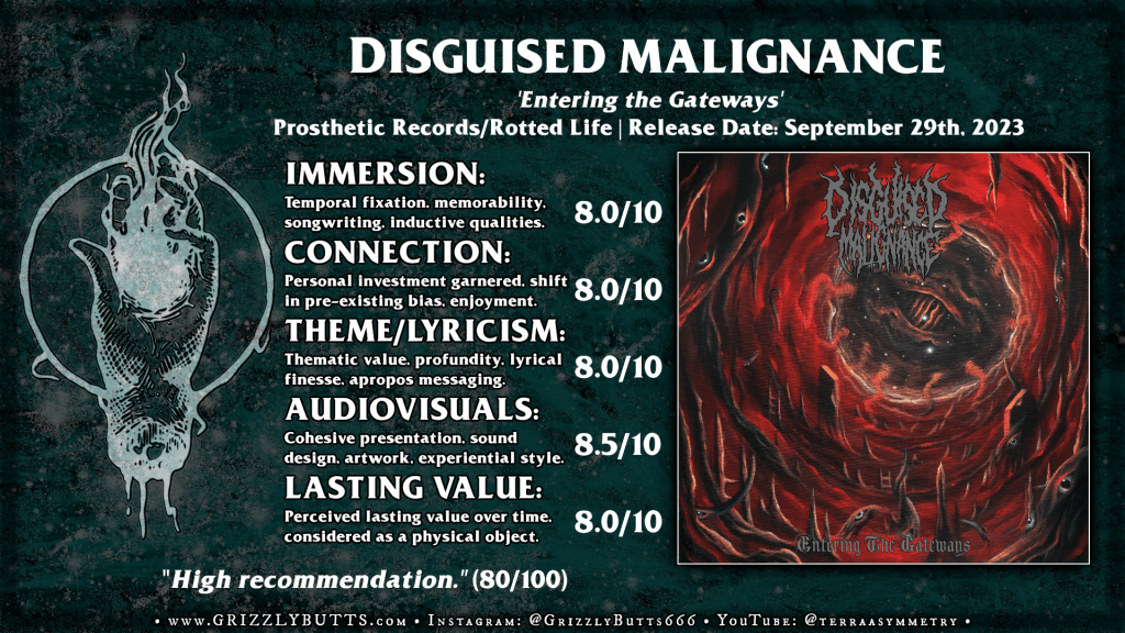 More than a good start, less than a masterpiece ‘Entering the Gateways‘ does not lack in terms of performative proficiency, brutality and ease of semi-melodic incorporation yet the core singularity doesn’t fully spawn here, there is no one moment where a fully unique entity is arisen with their idiosyncratic knack. Nonetheless Disguised Malignance offer an impressive study of the percussive nature of death metal from a fairly inclusive perspective, bringing the riffs and reaching for some admirable ‘old school’ appeal with natural ambitions (see: “Disengagement Into Eternity”) in mind for the future. They’re all set up with mounding potentiate for something great yet this experience is doesn’t quite hit that nuclear hot point of insanity just yet. A high recommendation.