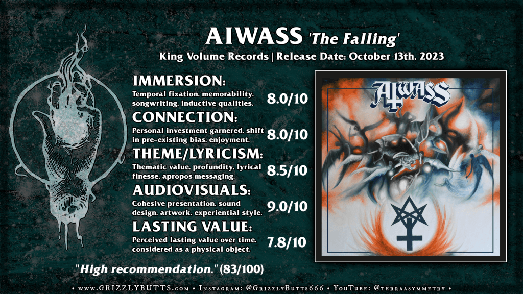 The dial hasn’t been pushed ’til broken off, yet. — If touring a bit off the first album allowed a practical sense of self in space, characterization and songcraft per ‘The Falling‘ then the next logical step has already been taken in terms of expanding into an actual line-up as the one general note to improve upon here is that the style, the depth of experience, and the auteur are all alight but what is missing here most is the mastery of rhythmic detail, the riffs. I’m not expecting ‘The Skull‘ or ‘Nightfall‘ part two but, a certain stylized knack that goes deeper into doom/sludge metal shapes without fiddling away the captivating mood Aiwass have summoned herein is the missing iota per my own sensibilities. That’s not to say that we’ve not gotten a deeper personalized rhythmic repertoire here, as closer “Crossing the Veil” suggests some devotional twang on the way out and earlier pieces are essentially (but not entirely) extreme metal toned at their most intense. There is a ways to go with this idea, more potential to be realized but the major accomplishment to be found on album number two comes by way of its vocal arrangements/songcraft in general.