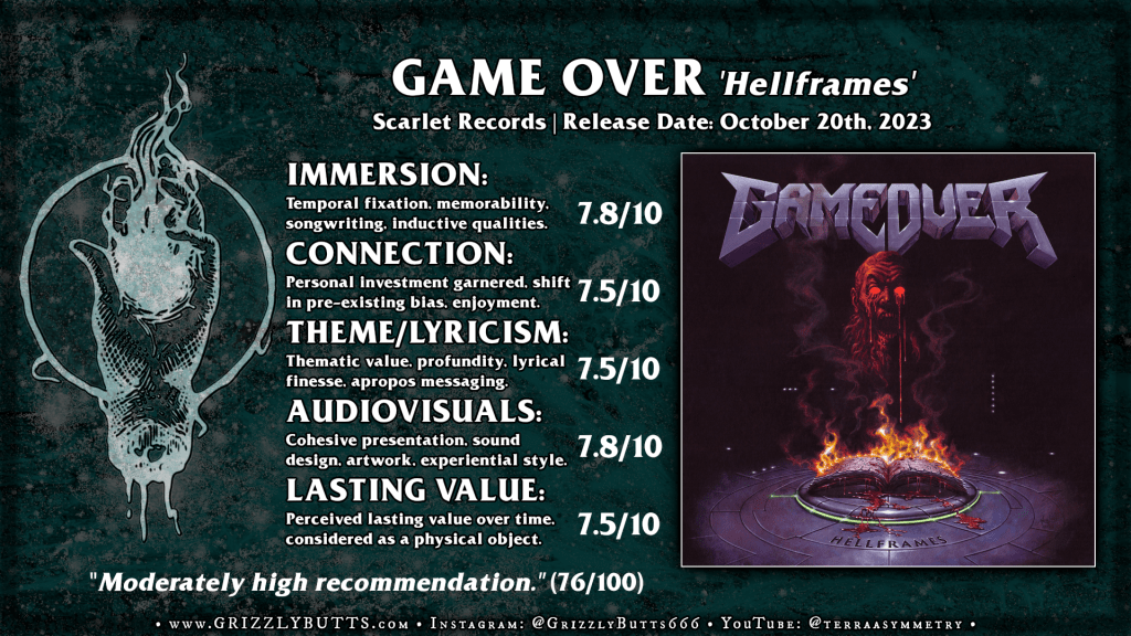 ‘Hellframes‘ is the fifth full-length album from Milan, Italy-based melodic thrash metal band Game Over since forming back in the late 2000’s and definitely don’t judge this one by its cover and assume it is a feral, extreme thrasher since it makes some really strange choices throughout. The first hint of this ain’t a hint at all as “Path of Pain” sounds like an outtake from Sentenced‘s ‘Frozen‘ back in the late 90’s when they’d gone gothic metal but still had a taste for riffs here and there. Most of the album displays this dynamic of more biting neo-thrash aggression with some crossover thrash inspiration (they obviously love Suicidal Tendencies‘ late 80’s breakthrough on some level) but they get there with vocals that sound more like Amorphis‘ ‘Am Universum‘ and I’m not at all suggesting that is a bad thing but an interesting shock to sit with as I hit songs like “The Cult”. And this song is important for the greater narrative where in an ancient dark cult is reborn through technology and gives us a portal to Hell as a result, something like Doom. I started to lose interest by the time “Count Your Breaths” hit mid-album since they’d pushed off the riffcraft but there are a few heavier choppers in the second half. I appreciated how “out there” this one was, I mean it doesn’t entirely work and I’m not sure who the style is for but they do manage something kinda infectious while they’re punching through it.