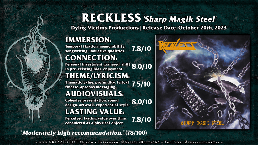 Bogota, Columbia-based throwback speed metal band Reckless kick of this debut album with a lot of energy most of it directed toward what I’d consider a German style propulsion to start with fair simple riffs, echoing reverberation of the vocals with plenty of speed applied to a well-curated vintage sound and sometimes this sounds even more ancient (or at least earlier 80’s) in its influence than Whiplash and Artillery. Instead of barreling through each piece riff-after-riff there is a bit of fanfare to these songs which recalls the earliest stuff from Agent Steel as much as it might dip into ’86 thrash aggression or traditional heavy metal swagger for the sake of a melody here and there. I particularly enjoy that indeterminate space in between the mean throttle of thrash metal and the trad metal kick of real speed metal and I figure anyone else who is that invested in the finite details of such things will appreciate this authentic feeling classics-minded heavy metal record. Favorite songs: “Neutralized”, “Crimson Obsession”, “Unholy Odyssey”.