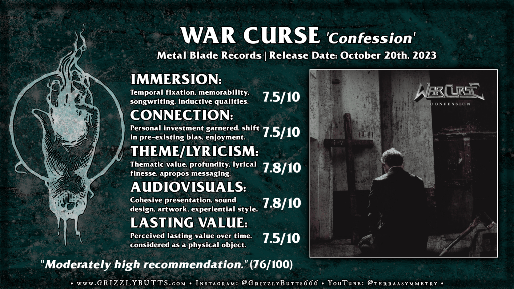 Ohio-based melodic thrash/alternative metal quartet War Curse were a “just alright” prospect back in 2019 when I’d given brief review of their second album for an end of the year list, the sort of band who had some fundamental linkage to classic thrash metal’s more accessible side, particularly the Bay Area gear, and made that their gig. Who doesn’t heckin’ love thrash’s tuneful side eh, but from my point of view they didn’t have the songs in ’em yet and bands like Testament and Death Angel haven’t necessarily lost that side of things. Here on album number three they pivot to melody driven alternative metal and no, not the cloying teenaged angst side of things but pieces that are all about putting together a catchy chunk of dramatism which already feels a far cry from the chugged-out ‘Eradication‘. The trade-off is some toothless riffs (“Miracle Broker”) radio metal harmonies, and a few hackneyed references to ‘AJFA‘ and the black album which aren’t hurting anyone. few songs manage a decent enough show for my taste with “Return to Dust” and “The Nothing (That is Me)” feeling at least kinda anthemic if not occasionally whiny. As more of a side note I’d appreciated the Grip Inc. cover, my brother used to practice that song for precision in our garage for hours each day when it first came out so, kinda cool to hear it given an entirely different atmosphere even if the intensity kinda floats off the piece overall. Any album that gets more folks listening to thrash is worthy in my realm, glad to see it even if the approach isn’t entirely for me.